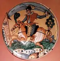 Arlecchino type plate with a horseman, an example of Montelupo's pottery from the beginning of the 17th century at the Royal Castle in Warsaw.