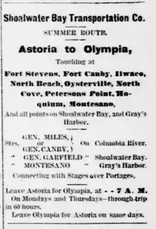Starting on March 14, 1883, the steamers of the Shoalwater Bay Transportation Company carried mail from Astoria to Montesano, Washington and then to Olympia once a week, with extra mail on Saturday.[11] It took one day on this route to reach Montesano from Astoria.[11] Travel time to Olympia continued to take 60 hours.[11]
