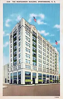 The Montgomery Building, listed on the National Register of Historic Places, is an iconic building located on Church Street in Spartanburg, Spartanburg County, South Carolina. It was built in 1924, and is a ten-story, nine-bay-wide, steel frame skyscraper faced in precast concrete. It originally housed the offices of textile companies, cotton brokers, and factories. The building also contained a theatre/auditorium space, a radio and television station. The Montgomery Building was the tallest building in Spartanburg until the 1950s.[2][3] In 2016, a developer announced a $29 million plan to renovate the building for mixed-use to include apartments, offices and retail.[4] Restoration began in Spring 2017 and was completed in December 2018.[5]