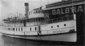 Late in the year 1906, Monticello under the command of Capt. Chris Moe, collided with her chief rival, Kitsap, under Captain Alf Hostmark. Following an investigation, both masters were censured by marine inspectors Whitney and Turner (who, apparently coincidentally, had been present in Portland, Oregon earlier that year at the launching of Kitsap.)[1] Monticello seems to have been operated out of Seattle from the Galbraith Dock (Pier 3), the so-called "Mosquito Fleet" dock.[2]