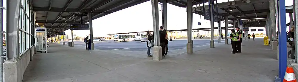 A large bus terminus with 10 platforms and an indoor waiting area adjoins the station. The building, which is operated by the RTM features an RTM ticket counter as well as a convenience store and a coffee shop. In addition, the station has parking for 1342 cars – 644 free outdoor park and ride spaces and 698 paying spaces (54 outdoor, 644 indoor).[6] The indoor spaces cost $7 a day or $80 per month (if a user purchases a monthly parking pass). All bus traffic enters and leaves on boulevard de l'Avenir, while all parking spaces are accessed via rue Lucien Paiement.