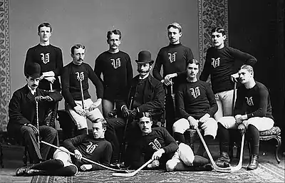 The Victoria Hockey Club of Montreal, Quebec, Canada was an early men's amateur ice hockey club. Its date of origin is ascribed to either 1874,[2] 1877[3] or 1881, making it either the first or second organized ice hockey club after McGill University. The club played at its own rink, the Victoria Skating Rink in Montreal. The club was winners of the Stanley Cup in 1895 and held it until 1899, except for a period in 1896. The club remained amateur, splitting from the ranks of teams turned professional in 1908. The club was the first winner of the Allan Cup and continued to play until 1939, when it folded after its 65th season.[2] The club often also fielded junior and intermediate teams.