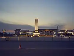 The Monument to the People's Heroes (Chinese: 人民英雄纪念碑; pinyin: Rénmín Yīngxióng Jìniànbēi) is a ten-story obelisk that was erected as a national monument of China to the martyrs of revolutionary struggle during the 19th and 20th centuries. It is located in the southern part of Tiananmen Square in Beijing, in front of the Mausoleum of Mao Zedong. The obelisk monument was built in accordance with a resolution of the First Plenary Session of the Chinese People's Political Consultative Conference adopted on November 30, 1949, with construction lasting from August 1952 to May 1958. The architect of the monument was Liang Sicheng, with some elements designed by his wife, Lin Huiyin. The civil engineer, Chen Zhide (陈志德) was also instrumental in realizing the final product.[1]