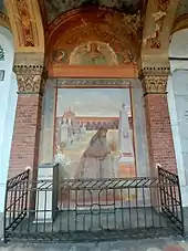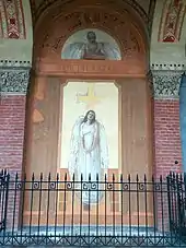 • A fresco depicting two angels looking at each other in the front wall of the chapel belonging to the Bianchi family. One is in front of a cross, on a monochromatic background, and the second one is elder in age and is painted as a half-bust located above the first angel;
