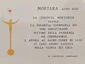 The COVID-19 pandemic has resulted in the death of many people around the world, including Italy and the city of Mortara. The Cemetery and the town council have dedicated a special section immediately after the entrance on the left side of the main pathway in remembrance of all the people that have died from the virus. The main part is a square area filled with small white stones which are surrounded by a terracotta-brick pathway, on which a stone bench has been positioned, and by some bushes on the left side.[26] A tombstone has been placed on the right side with the Italian text "La comunità mortarese piange la dolorosa scomparsa dei suoi concittadini vittime della pandemia da coronavirus e affida al sacro cuore di Gesù le loro anime assunte nella gloria dei cieli", which means "The Mortarese community mourns the painful disappearance of its fellow citizens victims of the coronavirus pandemic and entrusts their souls to the sacred heart of Jesus into the glory of heaven".[27]
