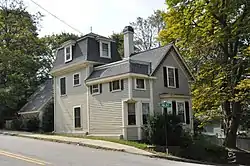 The house is distinctive for having three steeply pitched gable dormers in front, decorated with vergeboard, and for a small mansard-roofed tower added to the rear in the 1870s. The single-story front porch has a flat roof, with a decorative jigsawn valance.[2]