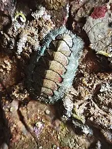 Mopalia ciliata is a chiton in the genus Mopalia, commonly known as the hairy chiton. It is a medium-sized marine mollusc up to 5.0 cm (2.0 in) in length. It is oval shaped with 8 separate, moderately elevated, overlapping ridged valves on its dorsal surface. Hairy chitons can be found along the coast of North America.