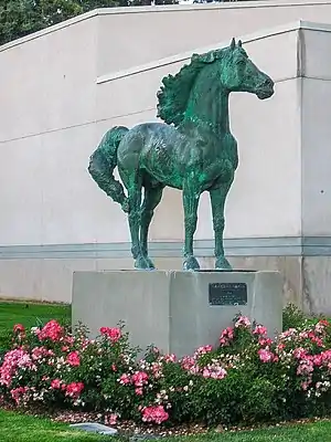 Morgan Horse was originally located at the Triton Museum of Art in San Jose. The Triton Museum was relocated to its present location in Santa Clara, and the sculpture was moved to its current site in front of the Museum (year unknown).[5]
