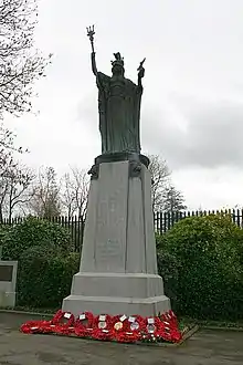 The memorial consists of a statue cast in bronze surmounting a granite plinth, the statue portrays Britannia in a Roman dress holding a trident aloft in her right hand and a statue of a winged man kneeling on one knee in her left hand, symbolising "victory". Located on her bodice is the royal emblem of 3 rampant lions, she is also wearing an elaborate plumed helmet with seahorses to either side. It is 22 feet tall including both statue and plinth.[6]