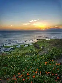 The Coast Walk, a two-day 30-kilometre (19 mi) walking track from Cape Schanck to London Bridge takes in almost the entire coastline of the national park. The walk features a network of cliff top tracks with spectacular ocean views and dense coastal vegetation, as well as sections of long beach walks which pass by sculpted sand dunes and tidal rock pools.[2] The Farnsworth Track links Portsea Surf Beach with London Bridge and is 2 kilometres (1.2 mi) in length.[3] The Coppins Track is a 3-kilometre (1.9 mi) return walking track from Sorrento Ocean Beach to Diamond Bay.[4] The Cape Schanck Lighthouse and associated buildings were constructed from 1859 and are excellent example of the architecture of the day.[5]