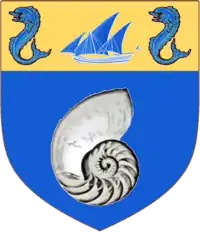 Azure the Cross section of a Nautilus Shell proper on a Chief Or a Karachi Lateen-Rigged Dhow between two Dolphins Azure;