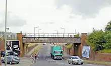 In an attempt to stimulate Oxford suburban traffic, the Great Western Railway opened three motor halts on the line, one of which was to be situated to the south of the railway bridge over Garsington Road (now classified the B480). The station was named Garsington Bridge Halt and its opening was approved by the Board of Trade in December 1907. The first services, operated by GWR steam rail motors, ran on 1 February 1908.[4] As with the other halts, Garsington Bridge had a single platform, 150 feet (46 m) long, with a 20 feet (6.1 m) by 70 feet (21 m) corrugated iron passenger shelter.[5] Steps linked the halt with Garsington Road.[6] The halt remained open for only seven years, being closed in 1915 as a First World War economy measure.[2]