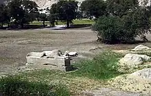 The Mortuary Temple of Amenhotep III, also known as Kom el-Hettân, was built by the main architect Amenhotep, son of Hapu, for Pharaoh Amenhotep III during the 18th Dynasty of the New Kingdom.[1] The mortuary temple is located on the Western bank of the Nile river, across from the eastern bank city of Luxor. During its time, the Mortuary Temple of Amenhotep III was the largest funerary complex in Thebes that was built.[1] Only parts of the mortuary temple's layout remain, as well as the Colossi of Memnon, which are two large stone statues placed at the entrance measuring 18 meters (59 feet) high.[2] Because the mortuary temple was built relatively close to the river, the annual flooding caused the site to decay at a more rapid rate. New research indicates that a large majority of the destruction on the mortuary temple can be attributed to the effects of an earthquake.[3] It was long speculated that the earthquake occurred around 27 BC; however, investigations into the mortuary temple and surrounding colossi have debunked this time frame and instead have demonstrated it occurred around 1200 BC. Additional earthquakes after the one in 1200 BC have not been ruled out.[3][4] The Colossi of Memnon and Amenhotep III Temple Project have helped conserve the site as well as possible.[5]