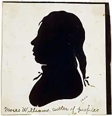 Williams also created silhouettes of the Peale family, including Charles Willson Peale and his wife, Elizabeth.[2] Williams made over 8,000 silhouettes during his first year working at Peale's Museum.[3] He earned between 6 and 8 cents for every silhouette he cut.[4] With the money Williams earned making silhouettes, he bought a house and married.[1]