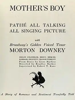 Mother's Boy is a 1929 American black-and-white musical drama film directed by Bradley Barker and starring Morton Downey and Beryl Mercer.