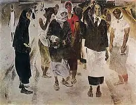 Painted in 1967, Mothers, Sisters was devoted to the destiny of Russian women in the years of the Great Patriotic War. It was created in five months, but its idea was born at the beginning of the Russo-German war in 1941 and based on the artist's personal knowledge.[2] "I remember my mother when she saw me to the war and how I came in and went away the villages when I was a soldier. I couldn't forget the women's eyes. I wanted to peep into them with my outgoing look," Moiseyenko reminisced.[3] The first sketch was made by the artist in 1965. Later he refined it in numerous preparatory sketches.[4] There are many of these sketches in the Museum of the Russian Academy of Arts. He made them in the 1960s in his native village of Uvarovichi, where he found the female characters for the painting. Among them are Woman with Girl, Lyuba, Nastya and many others.[5][6] The first variant of the painting was a big canvas, At the Collective Farm`s Yard (oil on canvas, 200х257. 1966). The second version was named Mothers, Sisters.[7] Mothers, Sisters was first presented at the largest exhibition called "Soviet Russia" in Moscow in 1967[8] and later in a large exhibition devoted to the fiftieth anniversary of the October Revolution, also in Moscow. The Leningrad Union of Soviet Artists and the Leningrad Culture Committee awarded this painting the Medal "For the Best Painting of the Year".[9][10] The work is dedicated to Moiseyenko's mother. Her destiny was typical for the war times. She went four years without even a letter from her son.[11][12] Moiseyenko painted her image as an old woman, although she was young at the time of the war.[13] Using the innovative experience of Soviet painting, especially an advancement of Aleksandr Deyneka, Moiseyenko applied the method of assembly composition in Mothers, Sisters.[14] The picture portrays some women saying goodbye to men leaving for the front. A lorry carrying soldiers has just driven off. Only women - mothers, sisters, wives - are standing on the road. The expressions on their faces convey a variety of feelings: uncomplaining grief, fortitude and readiness for hardship and struggle.[15] A well-known art-critic, Mikhail German, characterized Mothers, Sisters as one of the most powerful and tragic of Moiseyenko's paintings.[16] The Russian Museum has Mothers, Sisters in its collection.