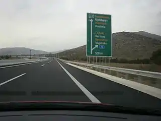 Motorway 29 (A29) is a branch of the A2 (Egnatia Odos) motorway, connecting it with the city of Kastoria and the Greek–Albanian border crossing at Krystallopigi. As from July 2017, the motorway is fully operational after the completion of the 15 km part between Koromilia and Krystallopigi at 14/7/17.[1][2][3]