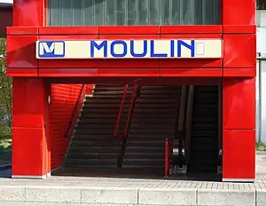 Moulin is a Charleroi Metro station, located on the border of Marchienne-au-Pont and Monceau-sur-Sambre (both part of the Charleroi municipality), in fare zone 2. The station is built on a viaduct and features a central platform with escalator and stairs access at the western end, leading to two separate street accesses (one on each side of the Rue de Mons).