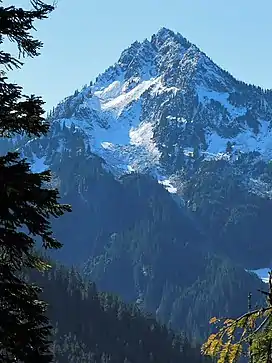 Mt. Fernow is composed of tonalite of the Mount Stuart batholith.[2] The history of the formation of the Cascade Mountains dates back millions of years ago to the late Eocene Epoch.[5] With the North American Plate overriding the Pacific Plate, episodes of volcanic igneous activity persisted.[5] Glacier Peak, a stratovolcano that is 25 mi (40 km) north of Mt. Fernow, began forming in the mid-Pleistocene.[2] In addition, small fragments of the oceanic and continental lithosphere called terranes created the North Cascades about 50 million years ago.[5]