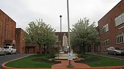 The back parking lot of the church and school where marble statues memorialize deceased parishioners