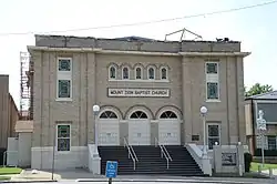 Mount Zion Baptist Church is a historic church at 900 Cross Street in Little Rock, Arkansas. It is a buff brick structure with modest Prairie School features on its exterior, with a three-part facade articulated by brick pilasters, and a trio of entrances set in the center section above a raised basement. The interior of the church is extremely elaborate in its decoration, with a pressed-metal ceiling, elaborate central copper light fixture, and banks of stained glass windows. The church was built in 1926 for a predominantly African-American congregation founded in 1877.[2]