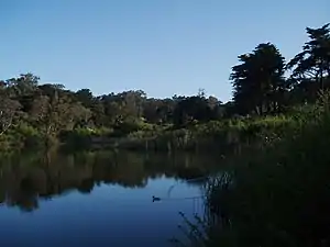 Mountain Lake is a 4-acre (1.6 ha) body of water[4] east of State Route 1 (Park Presidio Boulevard). The lake is at the southern tip of the Presidio of San Francisco and just south of the Presidio Golf Course. It is one of the last natural lakes in San Francisco and the only natural lake in the Golden Gate National Recreation Area.[1] The only natural freshwater lakes in San Francisco are Pine Lake, Lake Merced, and Mountain Lake.[5]
