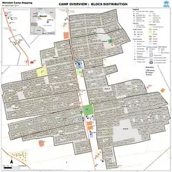 As of 14 January 2016, the following services were available in the camp: 1 hospital, 1 health post, 3 primary schools, 2 secondary schools, 2 youth centers, 1 food distribution center, 1 nonfood distribution center, 2 police posts, 1 common market, 1 camp based market, and 57 solar street lights.[2][4][5]