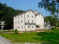 This district includes twelve contributing buildings, one contributing site, and five contributing structures. The buildings and structures were constructed roughly from 1800 to 1935, and include the general store, six houses, a mill, a grain elevator, a warehouse, and a Sweitzer barn.[2] Most of the buildings incorporate Late Victorian-style details. The structures are two bridges, a corn crib, a weigh station, and a mill race. The site is the site of a former mill and mill pond.[3]