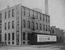 Mueller Co. was founded in 1857 by Hieronymus Mueller in Decatur, Illinois as "H. Mueller, Gun Shop".[3] Mueller closed the business briefly in 1858 to prospect for gold in Colorado, but returned to his business not long after, expanding it to include sewing machine and clock repairs and the sale of hunting and fishing equipment in addition to gunsmithing.[3] By 1880, the focus of Mueller's business shifted from manufacturing guns to manufacturing plumbing goods, and in 1885, Mueller changed the name of his business to "H. Mueller Manufacturing Co." and he moved the gun and sporting goods division of his company to a separate location.[3] By 1891, Mueller ran three separate businesses: a plumbing services shop, a plumbing goods manufacturing company, and a gun sporting goods store.[3] In 1896, Mueller's manufacturing business had grown so much, the family sold its gun and sporting goods business in order to focus entirely on producing plumbing goods.[3]