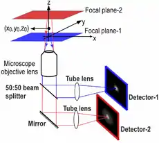 Multifocal plane microscopy (MUM), also known as multiplane microscopy or multifocus microscopy, is a form of light microscopy that allows the tracking of the 3D dynamics in live cells at high temporal and spatial resolution by simultaneously imaging different focal planes within the specimen.[1][2][3][4] In this methodology, the light collected from the sample by an infinity-corrected objective lens is split into two paths.[5] In each path the split light is focused onto a detector which is placed at a specific calibrated distance from the tube lens. In this way, each detector images a distinct plane within the sample. The first developed MUM setup was capable of imaging two distinct planes within the sample. However, the setup can be modified to image more than two planes by further splitting the light in each light path and focusing it onto detectors placed at specific calibrated distances. It has later been improved for imaging up to four distinct planes.[6][7] To image a greater number of focal planes, simpler techniques based on image splitting optics have been developed. One example is by using a customized image splitting prism, which is capable of capturing up to 8 focal planes using only two cameras.[8] Better yet, standard off-the-shelf partial beamsplitters can be used to construct a so-called z-splitter prism that allows simultaneous imaging of 9 individual focal planes using a single camera.[9][10] Another technique called multifocus microscopy (MFM) uses diffractive Fourier optics to image up to 25 focal planes.[11][12]
