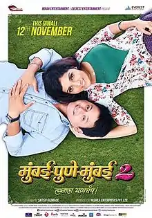 Mumbai-Pune-Mumbai 2 is a 2015 Indian Marathi-language romantic drama film directed by Satish Rajwade and distributed by Eros International. The film is the second installment of the Mumbai-Pune-Mumbai film series before its prequel titled Mumbai-Pune-Mumbai (2010)[3] and was followed by a sequel titled Mumbai-Pune-Mumbai 3 (2018). Released on 12 November 2015, the film stars an ensemble cast of Swapnil Joshi, Mukta Barve, Prashant Damle, Mangal Kenkre, Vijay Kenkre, Savita Prabhune, Asavari Joshi, Suhas Joshi and Angad Mhaskar. The screenplay and the dialogues were written by Ashwini Shende. The score and soundtrack album of the film are composed by Avinash-Vishwajeet with lyrics are penned by Shrirang Godbole, Ashwini Shende and Vishwajeet Joshi[4] and cinematography by Suhas Gujarathi. Subhash Nakashe is the film's choreographer while the editing was done by Rajesh Rao. The principal photography began in February 2015 and the film marks as the most awaited film in the Marathi cinema.[5]