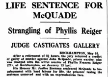 After McQuade's trial, Reiger's father Peter agreed to a newspaper interview with the Truth newspaper where he said that his daughter had planned a career in nursing and was preparing to leave for Mackay with references to show prospective employers.[16] Talking about McQuade, Peter Reiger said that he seemed to be "a nice enough chap at times" who would often visit on Sunday evenings when he and Phyllis would have a "sing-song".[16] However, he said that McQuade "was a jealous sort of man" who would threaten former prisoners from the gaol where he worked if they went into the Excelsior Hotel and talk to Phyllis.[16] Peter Reiger claimed McQuade had said: "Fancy those fellows talking to Phyllis. Just wait till they get back to prison and I'll put them in their place."[16] Peter Reiger also expressed sympathy for May McQuade who described her as an "innocent victim" who he couldn't help feeling sorry for.[16]