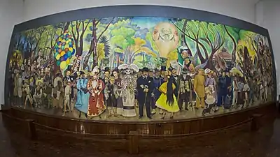 In 1946, architect Carlos Obregón Santacilia asked Diego Rivera to create a mural for the Hotel del Prado's Versalles dining room. The subject for the mural was the Alameda Central, which was across the street from the hotel. The artist made a fresco of 4.70 x 15.6 m. It was finished in 1947. The mural shows more than 150 figures, some of them leading characters the history of Mexico: Hernán Cortés, Benito Juárez, Maximiliano de Habsburgo, Francisco I. Madero, Porfirio Díaz. In addition, individuals from different social classes appear, including street vendors and revolutionaries. It also shows Frida Kahlo and other wives of the artist, as well as some of his daughters; the Alameda Central itself can be seen in the background.