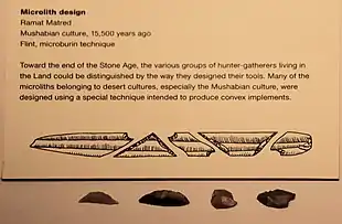 "A contemporary desertic entity was labeled "Mushabian," and was considered to be, on the basis of the technotypological features of its lithics, of North African origin. The fieldwork done in recent years in northern Sinai and the Negev has shown that the forms of the Mushabian microliths (mainly curved and arched backed bladelets) and the intensive use of the microburin technique was a trait foreign to previous Levantine industries, but instead is closer to the Iberomaurusian."[5]
