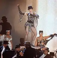 In 2012, Madonna included the song on her Super Bowl XLVI halftime show set list, where it was remixed with LMFAO's "Party Rock Anthem" and "Sexy and I Know It".[137] The same year, she performed it on The MDNA Tour at New York City's Madison Square Garden, on November 13. She invited South Korean rapper Psy and performed together his song "Gangnam Style" and her 2008 single, "Give It 2 Me".[138] "Music" opened the final section of the Rebel Heart Tour (2015–2016), with Madonna decked in a "Harlem-flapper-meets-Paris-in-the-Twenties" dress, adorned with thousands of Swarovski crystals.[139] The song "began as a Jazz Age ballad before kicking into banger mode".[140] Madonna's dancers were dressed in Golden Twenties inspired costumes with one of them topless.[140][141] Joe Lynch from Billboard, opined that "the presence of 'Music' was an effective reminder that while some compulsive naysayers tsk the Queen of Pop for trend chasing with Diplo, she brought techno to the pop mainstream years before EDM was an ubiquitous term".[140] The performance of the song at the March 19–20, 2016 shows in Sydney's Allphones Arena was recorded and released in the live album, Rebel Heart Tour.[142] On December 6, 2016, Madonna performed "Music" during the Carpool Karaoke segment of The Late Late Show with James Corden.[143] On April 30, 2022, Madonna joined singer Maluma during his Medallo en el mapa concert in Medellín, Colombia to perform "Music" along with their 2019 single "Medellín".[144] The song's refrain was also incorporated into the encore of Madonna's Celebration Tour in 2023.[145]