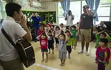 There are many benefits that music provides for children as they continue to grow. The benefits that young children acquire through music include social skills, emotional self-regulating abilities, cognitive benefits, and physical benefits. Socially, children have the opportunity to learn how to take turns and play with others while still playing individually, for example a band of little players each playing their instrument but yet looking at the big picture of playing with a group of little friends as well. Music also allows a smooth transitioning throughout daily activities, whether it be at home or in a classroom setting children get the idea of the following activity.[1] Allowing children to play with others, including adults or older siblings also gives them a boost of self-esteem. Also, different songs show children the different words used for emotions and body awareness, as well as extending their vocabulary in general. Additionally, by extending children’s vocabulary they can also learn of different cultural music and languages, for some the benefit to integrate home within their care-giving setting. Cognitive benefits also include learning how to count, recognizing sequencing and patterns, phonemic awareness, memorizing different songs for different experiences, and simply memorizing songs and their pace and tone. Physically, children’s all around gross and fine motor skills grow rapidly by learning how to move their body to music, moving their bodies to actions of a song, and as they grow by learning how to hold and play an instrument.[1][2]