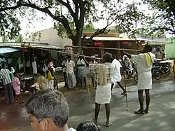 Gaana is a rap-like "collection of rhythms, beats and sensibilities native to the Dalits of Chennai."[2][3] It evolved over the past two centuries, combining influences from the siddhars (tantric adepts) of ancient Tamilakam, Tamil Sufi saints, and more.[2] Gaana songs are performed at weddings, stage shows, political rallies, and funerals. Performers sing about a wide range of topics, but the essence of gaana is said to be "angst and melancholy" based in life's struggles.[2] In the past few decades, the genre has entered the music of the mainstream Tamil film industry and gained popularity.[2][4] Contemporary gaana bands like The Casteless Collective are bringing the genre to new audiences while using it for social activism, especially against caste discrimination.[2]