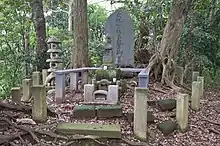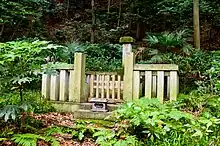 Further on are the temple's bronze bell and the cenotaphs to Prince Morinaga and his wife.[4] The plaque next to Prince Morinaga's cenotaph (in Japanese) reads: