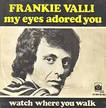 "My Eyes Adored You" is a 1974 song written by Bob Crewe and Kenny Nolan.[3] It was originally recorded by The Four Seasons in early 1974. After the Motown label balked at the idea of releasing it, the recording was sold to lead singer Frankie Valli for $4000. After rejections by Capitol and Atlantic Records, Valli succeeded in getting the recording released on Private Stock Records, but the owner/founder of the label, Larry Uttal, wanted only Valli's name on the label. It is from the album Closeup. The single was released in the US in November 1974 and topped the Billboard Hot 100 in March 1975.[3] "My Eyes Adored You" also went to number 2 on the Easy Listening chart.[4] Billboard ranked it as the No. 5 song for 1975.