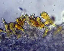 The spores are elliptic, smooth, and amyloid, with dimensions of 7–9 by 4–5 μm.[13] The basidia (spore-bearing cells of the hymenium) are club-shaped, four-spored, and measure 25–32 by 5.5–7 μm.[14] Pleurocystidia and cheilocystidia (cystidia on the gill faces and edges, respectively) are abundant and similar in morphology: club-shaped to somewhat capitate (with a head),[13] the tops sparsely to densely covered with small spines (said to resemble a mace),[18] filled with a bright orange pigment, and measuring 28–36 by 7–12 μm. The flesh of the cap is covered with a cuticle, on the surface of which are found scattered cystidia similar to those on the gills. Directly beneath the cuticle is a layer of enlarged cells, and beneath this are filamentous hyphae.[13] Clamp connections are present in the hyphae.[14]