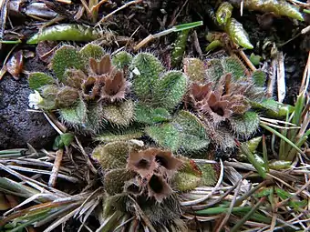 Myosotis antarctica plants are single rosettes. The rosette leaves have petioles 1–20 mm long. The rosette leaf blades are 3–26 mm long by 1–11 mm wide (length: width ratio usually 1.0–4.0: 1), narrowly oblanceolate to very broadly obovate, widest at or above the middle, green or brown, with an obtuse apex. The upper surface of the leaf is densely covered in curved or flexuous, patent to erect, evenly-distributed antrorse (forward-facing) hairs, whereas the lower surface of the leaf is similar but with fewer hairs (ranging from glabrous to with sparsely distributed hairs). The hairs on the leaf edges are appressed to spreading. Each rosette has multiple prostrate, bracteate inflorescences that are usually up to 15 cm long (rarely up to 31 cm long). The cauline leaves are similar in size and shape to the rosette leaves and usually sessile. Each inflorescence has up to 46 flowers, each borne on a very short pedicel, with a bract. The calyx is 1–4 mm long at flowering and 2–7 mm long at fruiting, lobed to one-third to three-quarters its length, and hairs that are sometimes of two different lengths and types. The corolla is white, cream, or blue, up to 4 mm in diameter, with a cylindrical tube, and small yellow scales alternating with the petals. The anthers are very short (usually < 0.3 mm long) and fully included. The four smooth, shiny nutlets are usually 1.2–1.9 mm long by 0.8–1.2 mm wide and are ovoid in shape.[5]