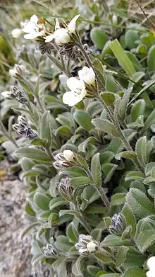 Myosotis saxosa is a forget-me-not originally collected from Titiokura, Hawkes Bay, North Island, New Zealand.[4] Some specimens collected in other areas Hawkes Bay, East Cape (Hikurangi) and even on the South Island have been variously identified as M. amabilis or M. saxosa,[13][3] and the two species require taxonomic revision.[9] Recent efforts to relocate plants at some North Island localities have been unsuccessful.[9]