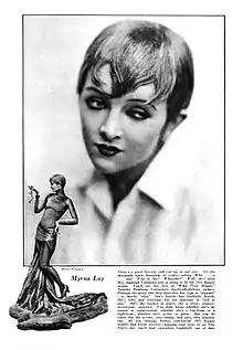 While Loy was dancing in prologues at the Grauman's Egyptian Theatre, portrait photographer Henry Waxman took several pictures of her that were noticed by Rudolph Valentino when the actor went to Waxman's studio for a sitting.[33] Valentino was looking for a leading lady for Cobra, the first independent project he and his wife Natacha Rambova were producing.[34] Loy tested for the role, which went to Gertrude Olmstead instead, but soon after that she was hired as an extra for Pretty Ladies (1925), in which she and fellow newcomer Joan Crawford were among a bevy of chorus girls dangling from an elaborate chandelier.[35]