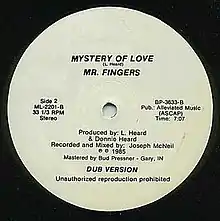 There are multiple iterations of "Mystery of Love".[3] The first was an original version, which Heard described as his "personal prototype" which he made three acetate copies of, one copy owned by Heard, and others given to Chicago DJs Frankie Knuckles, Ron Hardy. According to Heard, these acetates have changed hands several times.[4] The 1985 version of the track is at a slow tempo, at about 110 beats per minute.[3] A second version was credited to Fingers Inc. and made for the label DJ International Records. This version was re-recorded in a studio with vocals by Heard's friend Robert Owens.[3][4] This version is credited to Fingers Inc.[3] Heard felt that " the first one is just special for me, it just holds the essence of what I was doing, what just naturally flowed out of me. The next ones ended up being more rehearsed, so I don't really feel the same intensity in those versions, but that's showbiz, I guess."[4]