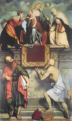 Mystic Marriage of Saint Catherine is an oil on canvas painting by Moretto da Brescia, executed c. 1543, on display on a side altar in the Church of San Clemente in Brescia.[1] In the upper register are Catherine of Alexandria, the Madonna and Child and Catherine of Siena, whilst below are Paul and Jerome.[2]
