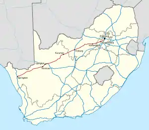 The N14 is a national route in South Africa which runs from Springbok in the Northern Cape to Pretoria in Gauteng. It passes through Upington, Kuruman, Vryburg, Krugersdorp and Centurion.[1] The section between Pretoria and Krugersdorp is maintained by the Gauteng Provincial government and is also designated the P158.