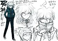 Nagito was created to be "an absolute rival" to Hajime Hinata, with Kazutaka Kodaka describing their relationship as similar to that of the Joker to Batman. Komaeda's characterization was aimed to give players a confusing view in regards to Nagito's true self, based on the morally dubious and contradictory actions he committed over the course of the game.[4] In regards to his design, Hajime was the earliest-designed character which generated a major contrast between his white clothing to Nagito's dark clothing.[5] Nagito was written to create a major impact into the game despite not being the lead or antagonist, symbolizing the prominent themes of hope and despair through his actions.[6]
