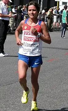 She placed ninth at the 2010 Boston Marathon, but went on to finish in second position behind Lithuania's Živilė Balčiūnaitė in the women's marathon at the 2010 European Athletics Championships, which led Russia to the title of the European Marathon Cup.[4] Yulamanova was subsequently awarded the gold medal after Balčiūnaitė was disqualified for a doping offence.[5]