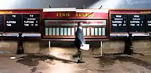 Nairobi railway station is a railway station located in Nairobi, Kenya.[2] The station is on the metre gauge Uganda Railway, and previously provided services to Mombasa three times per week.[3] However, in 2017, the new Mombasa-Nairobi Standard Gauge Railway took over services to Mombasa, starting from a new Nairobi Terminus in Syokimau, 20km from Nairobi CBD.[4]
