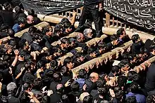 Nakh-Gardani is the act of carrying Nakhl, sometimes by "several strong men", on the Day of Ashura, as if it is Imam Husyan's coffin.[6] The ritual, historically dating back to pre-Safavids (almost 450 years ago[7]), is carried out at various places in Iran.[9] People carrying the Nakhl on their shoulders are guided by the people standing on the Nakhl.[7]